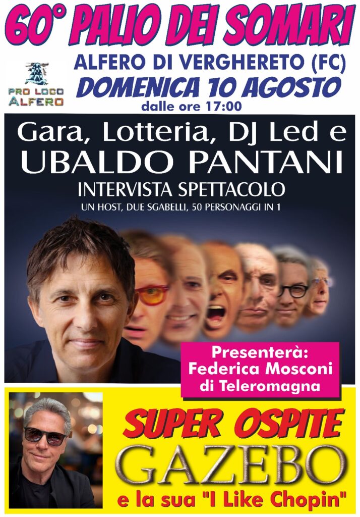 Il palio dei Somari andrà in scena alle ore 17.00 con la tradizionale sfilata medievale e l’attesissima corsa in sella al somaro, con competizione sia maschile che femminile… e da qui si sviluppano tutte le novità al Parco del Casone: cena allo stand e i super ospiti: il comico UBALDO PANTANI e a seguire il noto cantante degli anni ’80 GAZEBO con la sua I like Chopin, e a seguire Dj Led per tutta la serata.